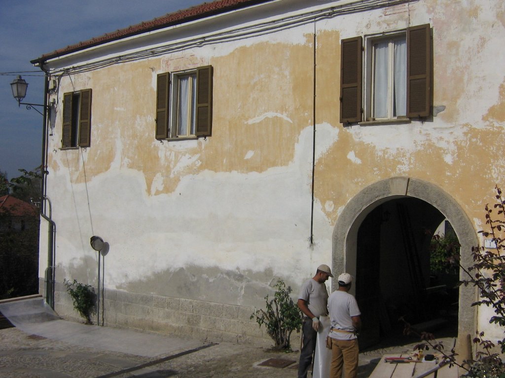 Sono state scrostate, nuovamente intonacate con intonaco a base di calce naturale e tinteggiate, con tinta sempre a base di calce naturale.